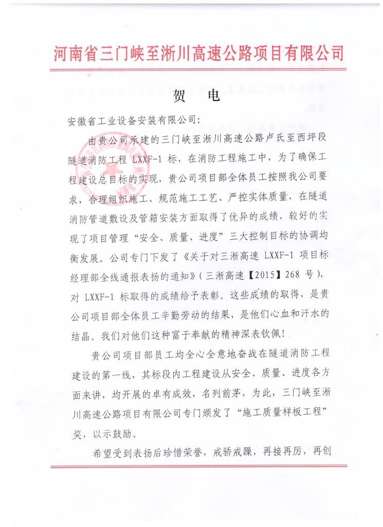 10月5日,公司收到河南省三門峽至淅川高速公路項目有限公司發(fā)來的賀電,信中對公司西北分公司在承建三門峽至淅川高速公路盧氏至西坪段隧道消防工程LXXF-1標(biāo)施工中,項目部合理組織施工、規(guī)范施工工藝、嚴(yán)控實體質(zhì)量,較好地實現(xiàn)了項目“安全、質(zhì)量、進(jìn)度”三大控制目標(biāo)協(xié)調(diào)均衡發(fā)展表示高度贊揚,對項目部全體員工辛勤勞動、無私奉獻(xiàn)表示衷心感謝,并給予表彰和獎勵。