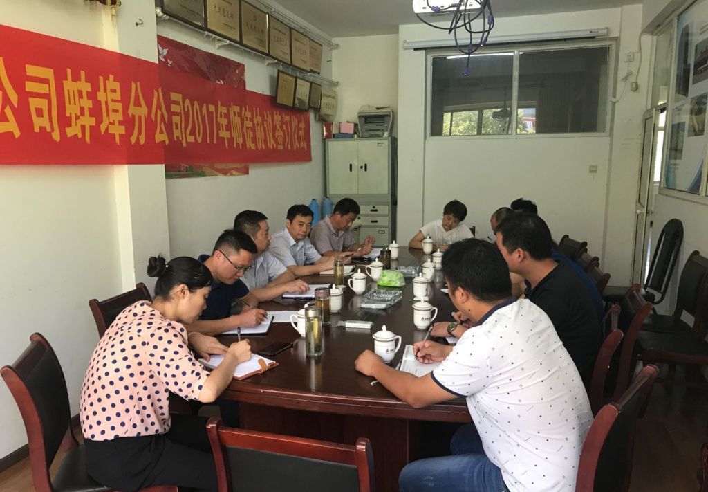 烈日當(dāng)空,酷熱難忍。7月21日下午,公司董事長、總經(jīng)理王軍邦,在紀(jì)委書記、工會主席李寬旭陪同下蒞臨蚌埠分公司調(diào)研指導(dǎo)工作。分公司領(lǐng)導(dǎo)班子及相關(guān)部門負(fù)責(zé)人參加了會議。會議由李寬旭主持。