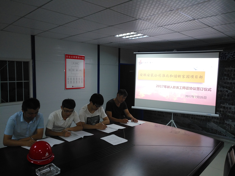 7月25日晚,安徽安裝公司淮北和諧新家園項(xiàng)目部精心策劃,嚴(yán)密組織,精選出思想作風(fēng)扎實(shí),工作經(jīng)驗(yàn)豐富,專業(yè)素質(zhì)過硬的老師傅與新入職員工舉行莊重的師徒協(xié)議書簽訂儀式。