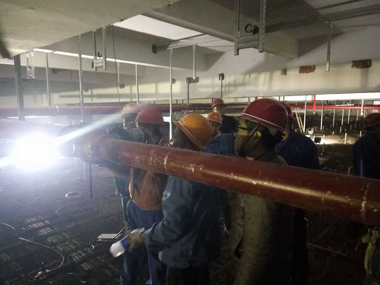 11月28日下午,公司副總經(jīng)理劉安俊一行蒞臨安徽中煙工業(yè)蚌埠卷煙廠易地搬遷項(xiàng)目部檢查指導(dǎo)工作。他首先檢查了項(xiàng)目部管理人員在崗情況,隨后不辭辛苦深入施工現(xiàn)場(chǎng),來(lái)到每一個(gè)施工班組,每一個(gè)施工點(diǎn)檢查指導(dǎo)。特別是在高架庫(kù)屋面板消防噴淋施工點(diǎn),滿堂腳手架,空間施工高度21米,劉安俊親自登上最高處施工平臺(tái)進(jìn)行指導(dǎo)。項(xiàng)目執(zhí)行經(jīng)理郭洋等陪同檢查并就現(xiàn)場(chǎng)項(xiàng)目的管理工作及存在的困難做了匯報(bào)。