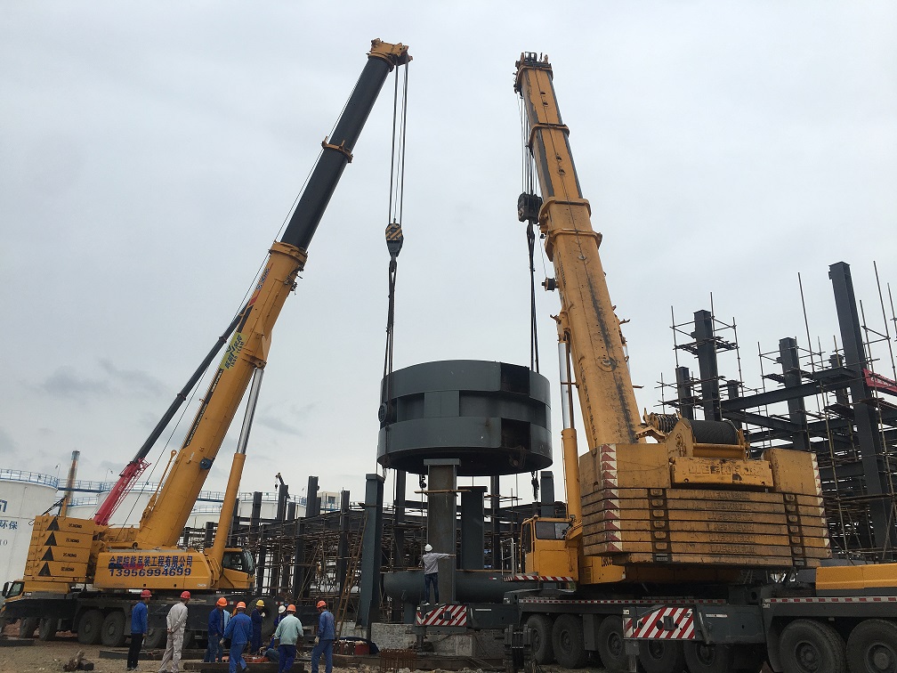 本次吊裝的反應(yīng)器中段部分重達(dá)220噸,分公司領(lǐng)導(dǎo)高度重視,吊裝前期,邀請(qǐng)公司總工吳繼成、總工辦主任牛守義和安全部王岳濤經(jīng)理親臨項(xiàng)目部參與設(shè)備吊裝的專題方案討論定稿工作。當(dāng)日上午,吊裝現(xiàn)場準(zhǔn)備工作緊張卻又有條不紊的進(jìn)行,項(xiàng)目經(jīng)理李子鳳向全體“參戰(zhàn)”員工進(jìn)行了安全交底,工作人員對(duì)兩臺(tái)分別為500T、350T吊車的站位及性能再次確認(rèn),現(xiàn)場機(jī)具、人員均按既定方案實(shí)施。分公司經(jīng)理史崇松、業(yè)主單位負(fù)責(zé)人、監(jiān)理全程在現(xiàn)場“督戰(zhàn)”,全體工作人員經(jīng)過四個(gè)小時(shí)的奮戰(zhàn),吊裝作業(yè)圓滿結(jié)束。