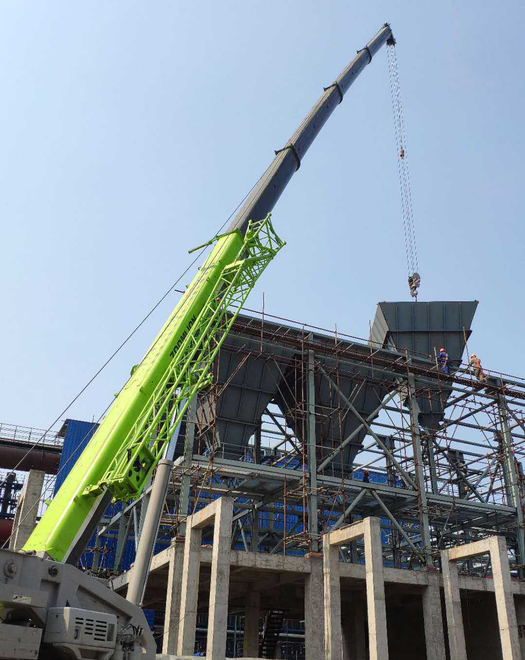 本次吊裝的反應器灰斗部分總重量達56噸,吊裝作業(yè)存在場地狹小、與土建單位交叉作業(yè)多、吊重荷載大等諸多困難,吊裝任務異常艱巨。為此,項目部提前合理部署,多次優(yōu)化吊裝方案,按照方案要求采用額定荷載為100噸的汽車實施吊裝作業(yè)。項目部在設備吊裝前對全體“參戰(zhàn)”人員進行了現場安全技術交底,明確施工工序、技術要點難點和安全風險點,做到分工明確、責任到位,吊裝工作有條不紊地展開。在各方力量的通力配合下,經過六個多小時的奮戰(zhàn),項目部終于完成了10臺灰斗以及現場輔助設備的吊裝任務。