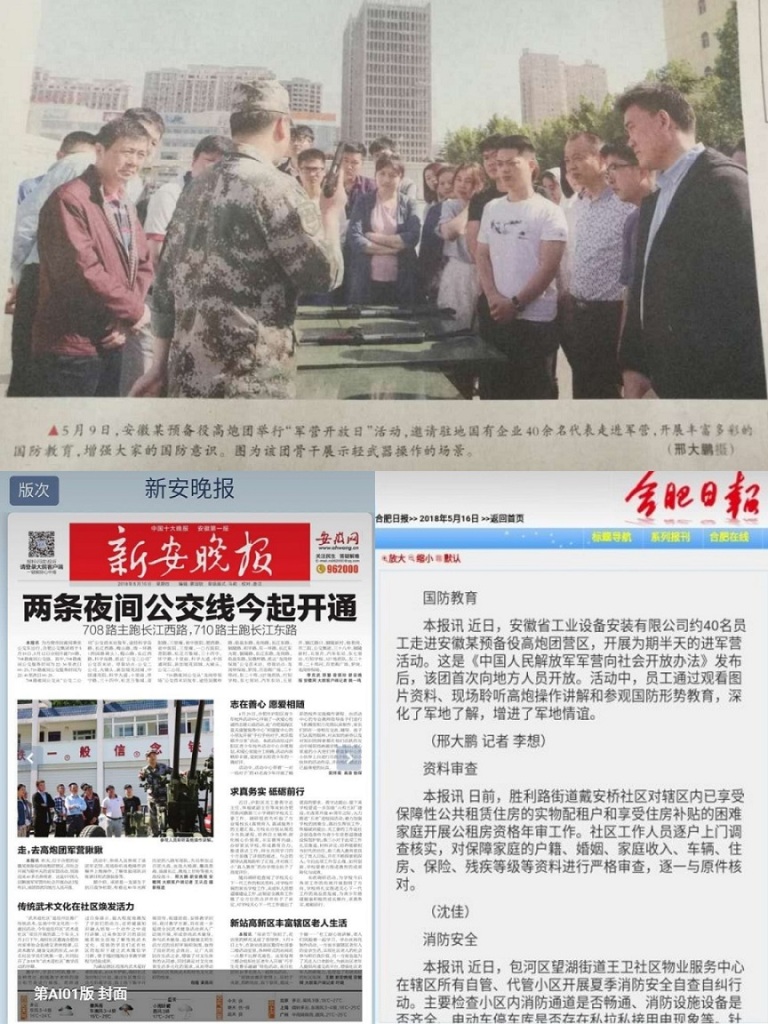自5月9日安徽安裝公司組織開展赴安徽預(yù)備役師高炮團(tuán)營區(qū)開展“走進(jìn)軍營·感受軍魂”愛國主義教育實(shí)踐活動(dòng)以來,合肥日?qǐng)?bào)、新安晚報(bào)、人民陸軍報(bào)等多家媒體對(duì)此活動(dòng)進(jìn)行了報(bào)道。