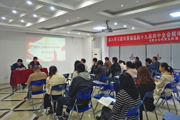 為深入學(xué)習(xí)宣傳貫徹黨的十九屆四中全會(huì)精神,打牢政治基礎(chǔ),堅(jiān)定政治方向,11月13日下午3點(diǎn),合肥分公司黨支部在公司十五樓職工之家組織召開(kāi)黨的十九屆四中全會(huì)精神學(xué)習(xí)專(zhuān)題會(huì),分公司領(lǐng)導(dǎo)班子成員、機(jī)關(guān)全體黨員干部及在肥項(xiàng)目部人員參加了會(huì)議,會(huì)議由黨支部書(shū)記胡迎東主持。