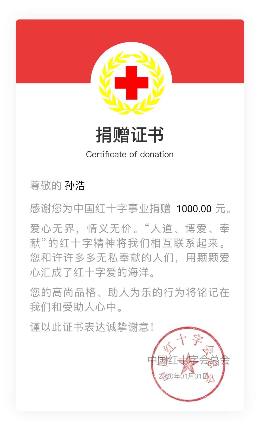 自新型冠狀病毒引發(fā)的肺炎疫情從湖北武漢爆發(fā)以來,始終牽動著眾人的心,更有不少愛心人士主動奉獻(xiàn)愛心。1月31日,孫浩一家三口懷著對武漢疫區(qū)同胞深深的愛,向中國紅十字會捐款抗擊疫情,以表達(dá)對武漢疫區(qū)人民的關(guān)愛。