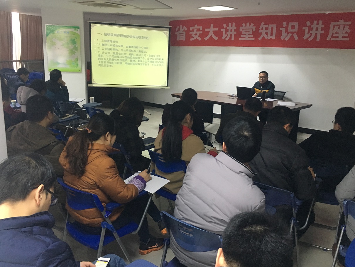 12月7日上午“省安大講堂”—招標(biāo)業(yè)務(wù)培訓(xùn)在職工之家開(kāi)課。本次培訓(xùn)由招標(biāo)辦副經(jīng)理李文山授課,公司機(jī)關(guān)、分公司、項(xiàng)目部相關(guān)人員共30余人參加。