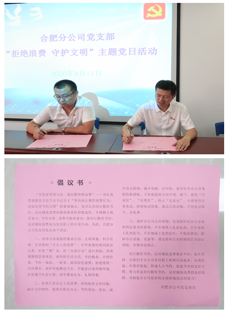 為認(rèn)真貫徹落實習(xí)近平總書記關(guān)于堅決制止餐飲浪費行為、切實培養(yǎng)節(jié)約習(xí)慣的重要指示精神,牢固樹立艱苦奮斗、節(jié)約光榮、浪費可恥的意識。8月20日下午,合肥分公司黨支部在職工之家組織開展了“拒絕浪費 守護(hù)文明”主題黨日活動。分公司黨員職工近60人踴躍參加。