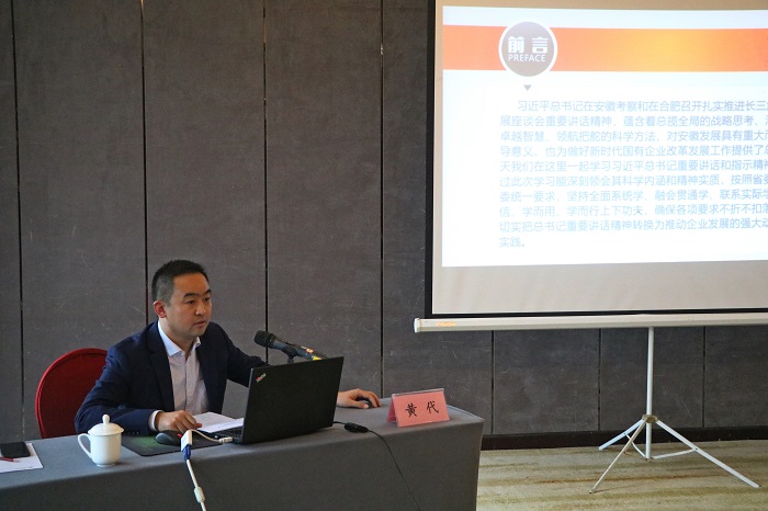 課上,黃代從四個方面宣傳貫徹了習(xí)近平總書記在安徽考察重要講話精神。一是提高政治站位,充分認識習(xí)近平總書記考察安徽重要講話指示的重大意義。習(xí)近平總書記考察安徽重要講話指示精辟論述了我省當(dāng)前和未來發(fā)展的一系列方向性、根本性問題,在安徽發(fā)展史上具有極其重大的里程碑意義,習(xí)近平總書記專程視察中國寶武馬鋼集團時發(fā)表的重要講話,也為我們做好國企工作提供了思想武器、指明了前進方向、注入了強大動力。全體黨員領(lǐng)導(dǎo)干部要按照省委、省國資委統(tǒng)一要求,堅持全面系統(tǒng)學(xué)、融會貫通學(xué)、聯(lián)系實際學(xué),確保深刻領(lǐng)會重大意義。二是把握核心要義,深刻領(lǐng)會習(xí)近平總書記考察安徽重要講話指示的精神實質(zhì)。“兩個堅持”“兩個更大”,是總書記講話的核心要義,深刻回答了“十四五”乃至今后一個時期安徽發(fā)展在黨和國家全局中應(yīng)該承擔(dān)的使命、肩負的任務(wù),將安徽的發(fā)展層次、工作要求提升到前所未有的高度,是當(dāng)前和今后一個時期引領(lǐng)安徽發(fā)展的總方針、總遵循。三是聚焦重點任務(wù),切實答好加快美好安徽建設(shè)和集團高質(zhì)量發(fā)展的必答題。全體黨員干部職工要深刻領(lǐng)悟全省領(lǐng)導(dǎo)干部“12個必答題”和安徽建工集團“10個必答題”,緊扣目標要求和各項任務(wù),謀深謀實貫徹落實的具體思路、促進發(fā)展的實際舉措、推動工作的保障機制。四是營造濃厚氛圍,全面掀起學(xué)習(xí)貫徹習(xí)近平總書記考察安徽重要講話熱潮。安徽安裝公司要以“大學(xué)習(xí)”“大宣傳”“大調(diào)研”“大落實”為抓手,確保對重要講話精神融會貫通、入腦入心、明晰思路、落地見效。