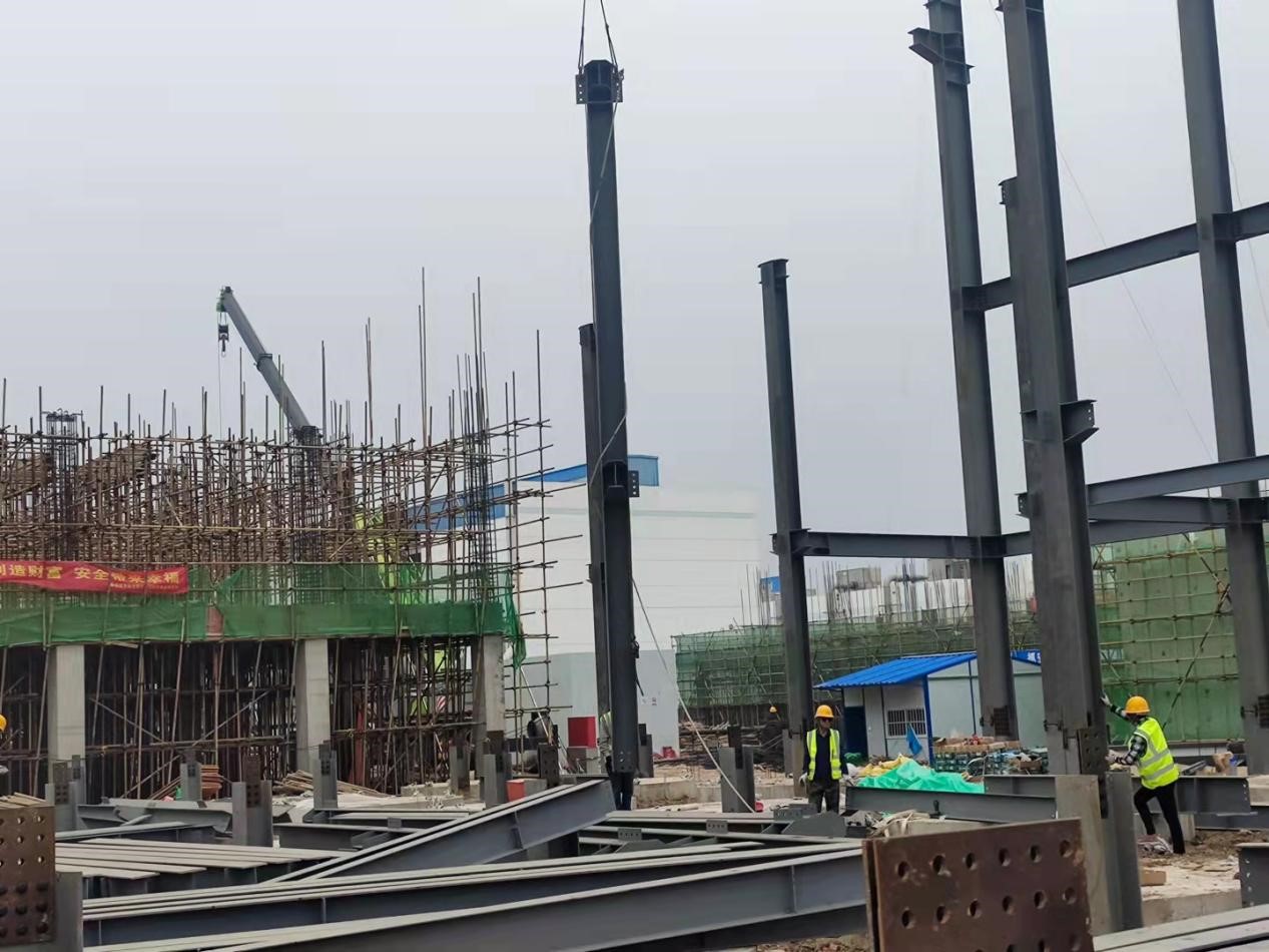 發(fā)酵車間C區(qū)鋼結(jié)構(gòu)區(qū)域,吊裝作業(yè)正在如火如荼進行;B區(qū)滿堂腳手架緊張搭設(shè),鋼筋工頂著烈日進行鋼筋綁扎,投料車間兩臺挖機聯(lián)動,進行管廊支架基礎(chǔ)基坑開挖,控制車間正在忙忙碌碌進行內(nèi)墻二次結(jié)構(gòu)砌筑。各個車間有條不紊的忙碌著,整個項目現(xiàn)場一片火熱,迅速掀起“比、學(xué)、趕、幫、超”施工高潮!