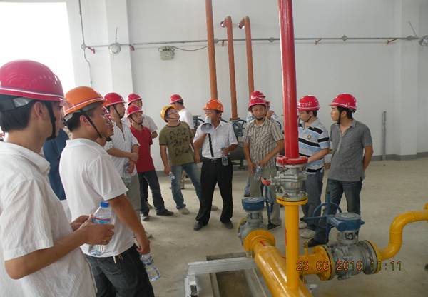 觀摩開始前,戴書記及包處長進(jìn)行動員講話,要求大學(xué)生一定要認(rèn)真聽講,珍惜這次觀摩學(xué)習(xí)的機(jī)會。項目部經(jīng)理趙永峰詳細(xì)介紹了工程概況及項目部對本工程的現(xiàn)場管理和安全生產(chǎn)、文明施工管理情況。業(yè)主周工對合成車間一、合成車間二的管道走向及工藝流程一一向大家講解,并對公用部分的設(shè)備功能逐一進(jìn)行了詳細(xì)的介紹。項目部鄭圣軍和徐松同志分別介紹了工藝管道、設(shè)備安裝和電氣安裝的相關(guān)流程。講解人講解細(xì)致,大學(xué)生們聽得認(rèn)真。