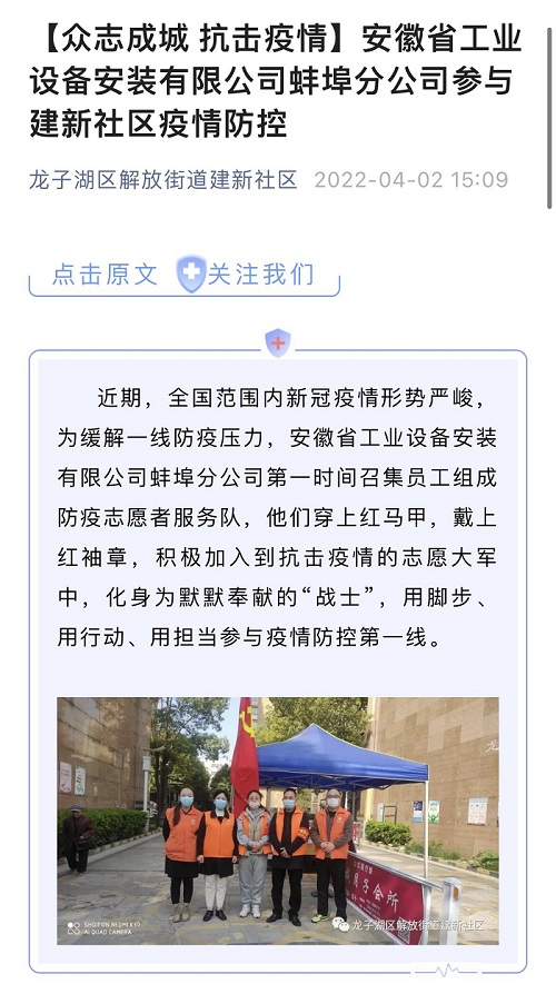 活動前,分公司黨支部主動對接建新社區(qū),該社區(qū)為蚌埠市優(yōu)秀社區(qū),位處老城區(qū),管轄范圍較廣、人員出入繁雜,了解情況后,支部及時在分公司QQ工作群發(fā)出疫情志愿者活動倡議,分公司班子成員帶頭報名,廣大員工積極響應(yīng),短短兩天收到20余人報名申請,并組建了志愿者服務(wù)隊。