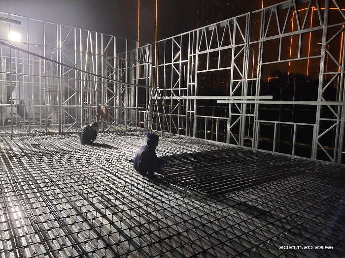 夜間綁扎三層地板鋼筋,雨天夜間搶工