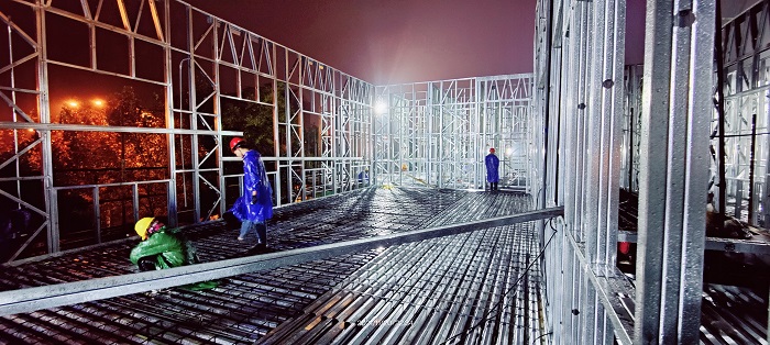 自11月初接到項目任務以來,面對一個月完成三層結(jié)構(gòu)方艙醫(yī)院主體機構(gòu)、內(nèi)部安裝、室外裝飾的極限工期,安徽安裝公司高度重視、精心組織、科學安排、迎難而上,全力以赴加快工程建設,期間,公司領導多次前往項目現(xiàn)場幫助協(xié)調(diào)解決工程施工中的難點、困難,為項目人員鼓勁加油;公司相關部門負責人駐扎項目一線,指導協(xié)調(diào)內(nèi)部流程、現(xiàn)場施工、外部對接、質(zhì)量安全等一應事務;分公司第一時間組織精干力量進入項目現(xiàn)場,梳理現(xiàn)場情況,核對圖紙清單,進行施工準備。從公司領導到項目一線,安徽安裝公司自上而下以高度的使命感和責任感,投入到緊張的工程建設中去。項目管理人員披星戴月,從早上到夜間駐守在項目一線,每日召開工程會議,討論施工工作進展,制定下一步工作計劃,安排交叉作業(yè)工序。為保障夜間施工安全,項目部安排兩名安全員輪流值守項目現(xiàn)場,夜間在項目現(xiàn)場不斷巡查確保施工安全、高效開展。