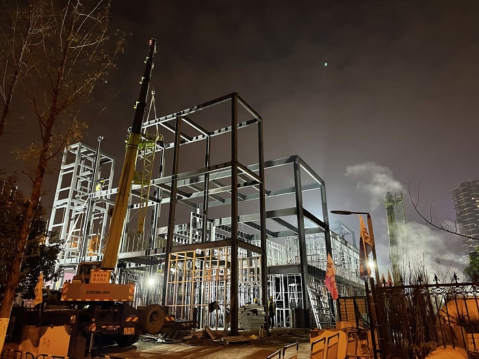 為搶抓工期,項目部迅速調(diào)集人力,自開工以來,項目一線施工人員一直保持在150人左右,采取24小時輪班制度,兩班倒的方式,“人歇工地不停”,在嚴格實施安全防疫的同時加班加點搶時間,趕任務,確保項目現(xiàn)場施工不斷推進,即使是在不利于施工作業(yè)的雨天,大家也合理安排施工計劃,主動放棄休息,在已經(jīng)封頂?shù)囊粚?、二層結(jié)構(gòu)中進行水、電、通風、內(nèi)部裝飾等工作,全力以赴加快項目建設進度。