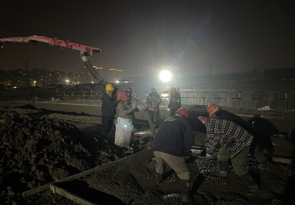 工人師傅們晚上加班加點進(jìn)行西動力中心基礎(chǔ)墊層澆筑
