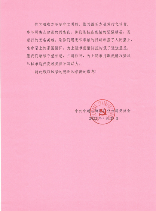 信中對(duì)安徽安裝公司與中建二局浙江分公司共同援建上饒市人民醫(yī)院北城區(qū)集中隔離點(diǎn)給予高度的肯定和認(rèn)可。當(dāng)前,新冠疫情形勢(shì)嚴(yán)峻,安徽安裝公司在嚴(yán)格落實(shí)屬地疫情防控措施的同時(shí),一方面積極參與本地區(qū)隔離點(diǎn)、醫(yī)院發(fā)熱門診的緊急建設(shè)任務(wù);另一方面攜手相關(guān)行業(yè)兄弟單位同心協(xié)力、援建市外防疫區(qū)域,承擔(dān)起國(guó)有企業(yè)社會(huì)責(zé)任,竭盡所能地為防疫建設(shè)貢獻(xiàn)最大的力量!