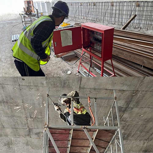 圖為花園大道道路工程項目現(xiàn)場臨時用電檢查及登高架焊接場景