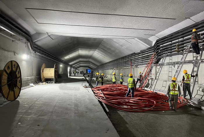 目前,項目下穿隧道東、西側(cè)1#2#配電房一次性送電成功,能夠提供隧道現(xiàn)場施工用電,東側(cè)雨水泵房和中間廢水泵房已完成施工任務(wù),隧道里的橋架安裝、電纜敷設(shè)、消防水管安裝、照明燈具安裝及各附屬設(shè)施安裝建設(shè)也正在加速進行當(dāng)中。
