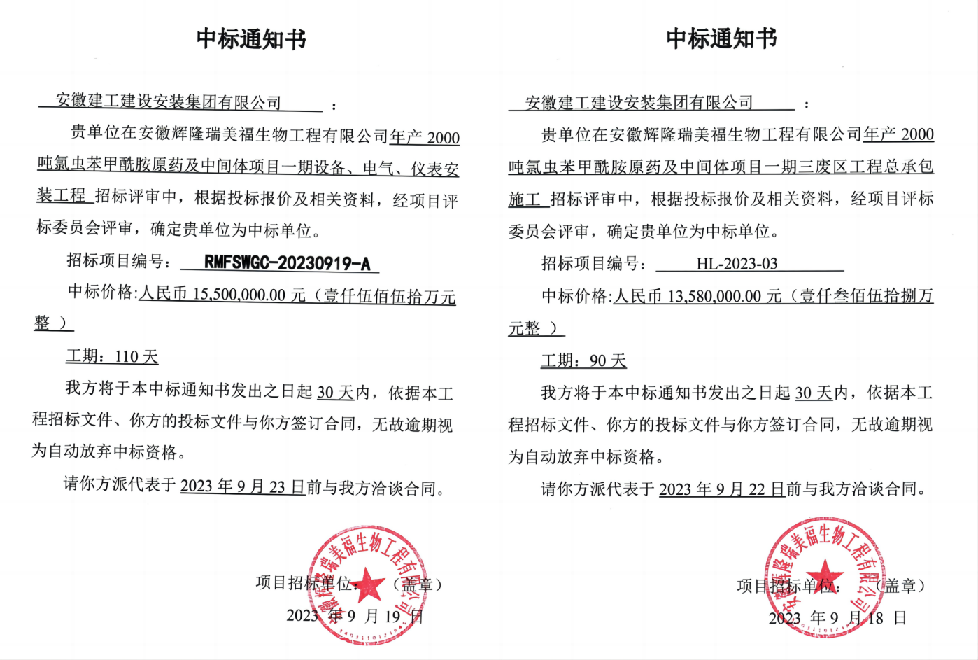 喜訊連連!建工安裝蚌埠分公司在本月連續(xù)中標安徽輝隆瑞美福生物工程有限公司年產(chǎn)2000噸氯蟲苯甲酰胺原藥及中間體項目一期三廢區(qū)總承包及設(shè)備安裝工程,合計中標金額2908萬元。分公司前期已中標并施工該項目一、二標段,目前已累計中標四個標段,合計中標金額達1.55億元,至此,輝隆一期經(jīng)營工作圓滿達到預(yù)期目標。