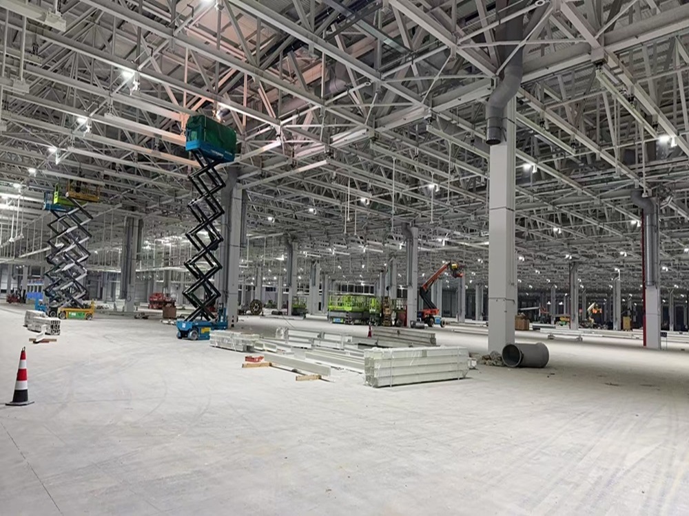 截至目前,車間一B區(qū)焊裝車間內(nèi)的給排水管道、消防管道、暖通風管、空調(diào)水管、虹吸雨水、630循環(huán)水管均全部安裝完成,已全面進入試壓階段。正在進行車間一沖壓車間及QA樓安裝工作,電氣系統(tǒng)進入電纜放線安裝階段,暖通系統(tǒng)進入風口風閥安裝階段。