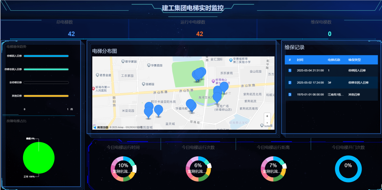 新搭建的電梯管理模塊構(gòu)建起高效的數(shù)據(jù)互通橋梁,不僅能夠?qū)崟r獲取已上線電梯編號、電梯設(shè)備名稱等各項基礎(chǔ)數(shù)據(jù),還能精準(zhǔn)監(jiān)測電梯運行時間、運行距離、運行次數(shù)、開門次數(shù)等動態(tài)數(shù)據(jù)信息。該系統(tǒng)可全程追蹤電梯召修記錄,詳細(xì)記錄召修維保上報時間、電梯維保人員到場時間,以及電梯故障處理過程、因故障困人后的解救時間等信息。這些數(shù)據(jù)的全面整合與實時呈現(xiàn),能夠全方位、立體化掌握每臺電梯的運行狀態(tài)及故障率,增強(qiáng)了電梯運行的安全性和可靠性,有效提升電梯維保效率。